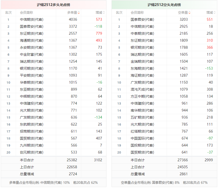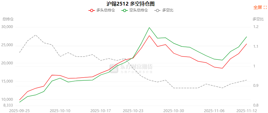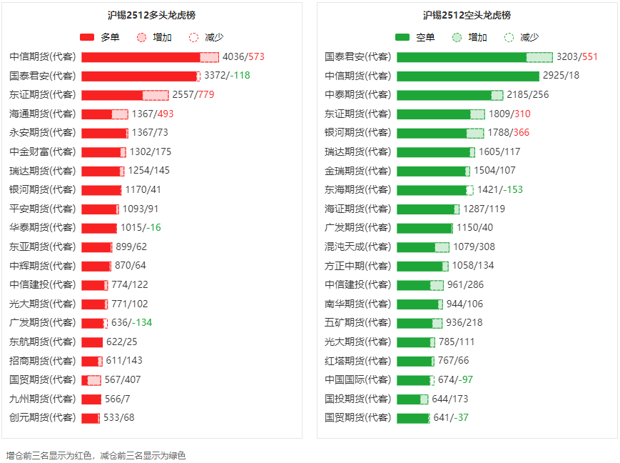 总体而言,沪锡2512合约今日增仓上行,多空持仓排名前20席中,多空双方均呈进场态势,多头进场意愿弱于空头。